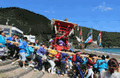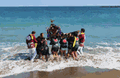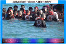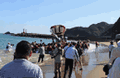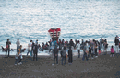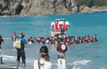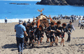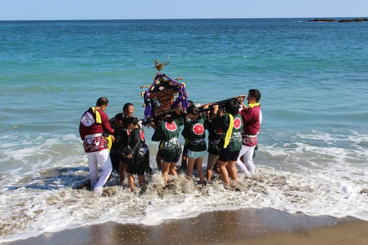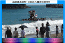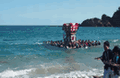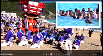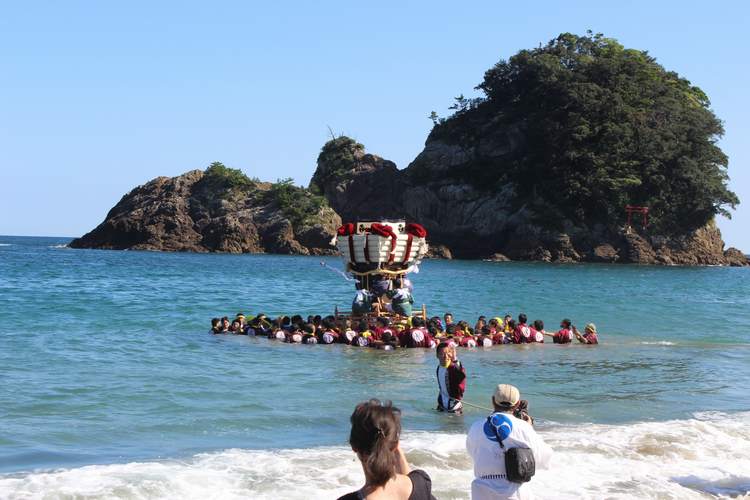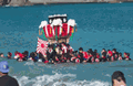 大浜海岸では、「ちょうさ」(勇み太鼓)は、筏のように、木材で組んだ 担ぎ棒で、担がれます、順次海に入ります。